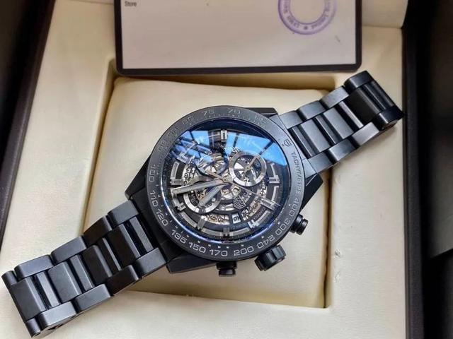 如果觉得以上几款都过于经典,不能满足桀骜不羁的你。那么你就可以尝试一下这款泰格豪雅卡莱拉全黑哑光陶瓷计时腕表,表盘以镂空形式呈现大胆、不拘一格的外观设计,表环、机芯夹板、日历轮等色泽运用恰到好处,突破传统刻板印象。